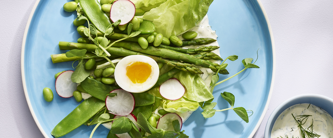 Smør dressing ud på portionstallerkener og top med hovedsalat, asparges, sukkerærter, edamamebønner og radiser.