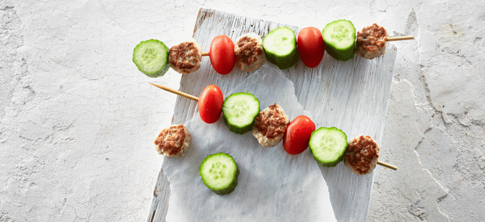 Fordel frikadeller, cherrytomater og agurk i tykke skiver på de to spyd.
