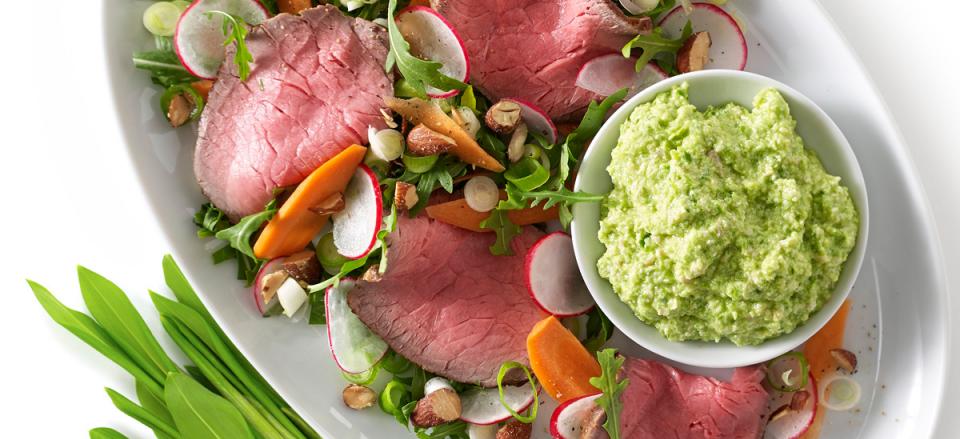Anret et stort flot fad med alle grøntsagerne, stil en skål med ramsløgpesto på fadet og stik stykker af roastbeefen ind i salaten.