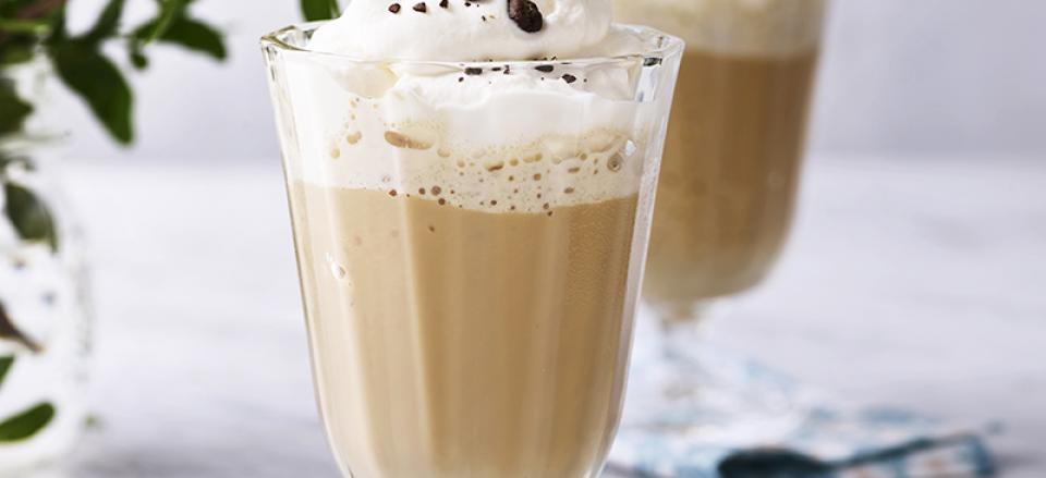 Hæld den på glas, og pynt med flødeskum og et drys malede kaffebønner.