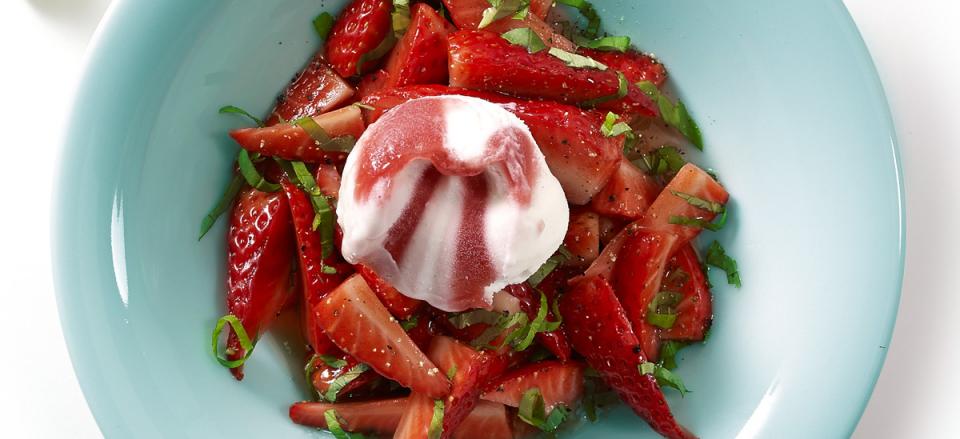 Fordel marinerede jordbær på tallerkener og kværn lidt sort peber på og top op med en kugle Frozen skyr med jordbær.
