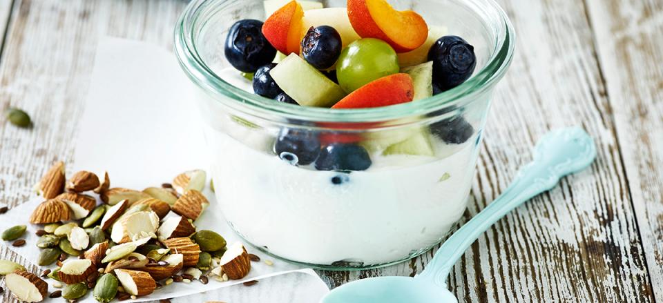 Frugtsalat med yoghurt og knas