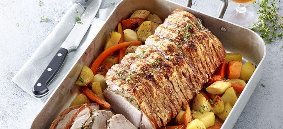 Fyldt grisekam med østershatte og rodfrugter
