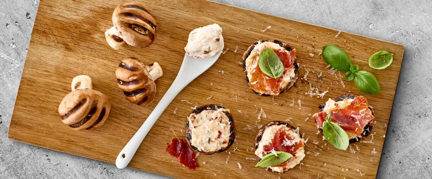 Fyldte, grillede champignoner med flødeost og parmaskinke