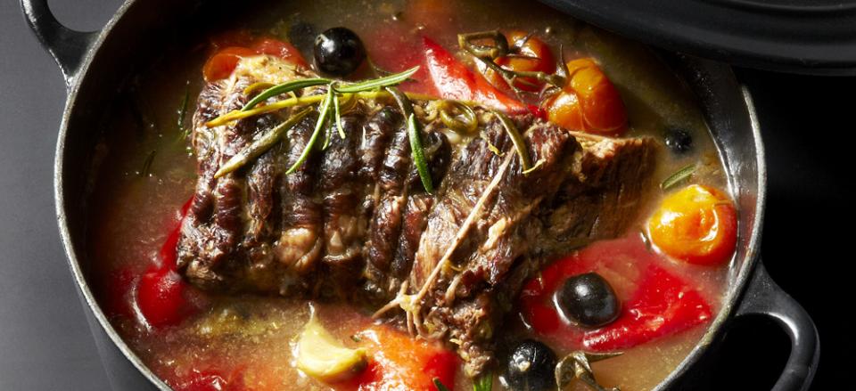 Læg tomater, rød peber, oliven, citronskal og rosmarin ved.