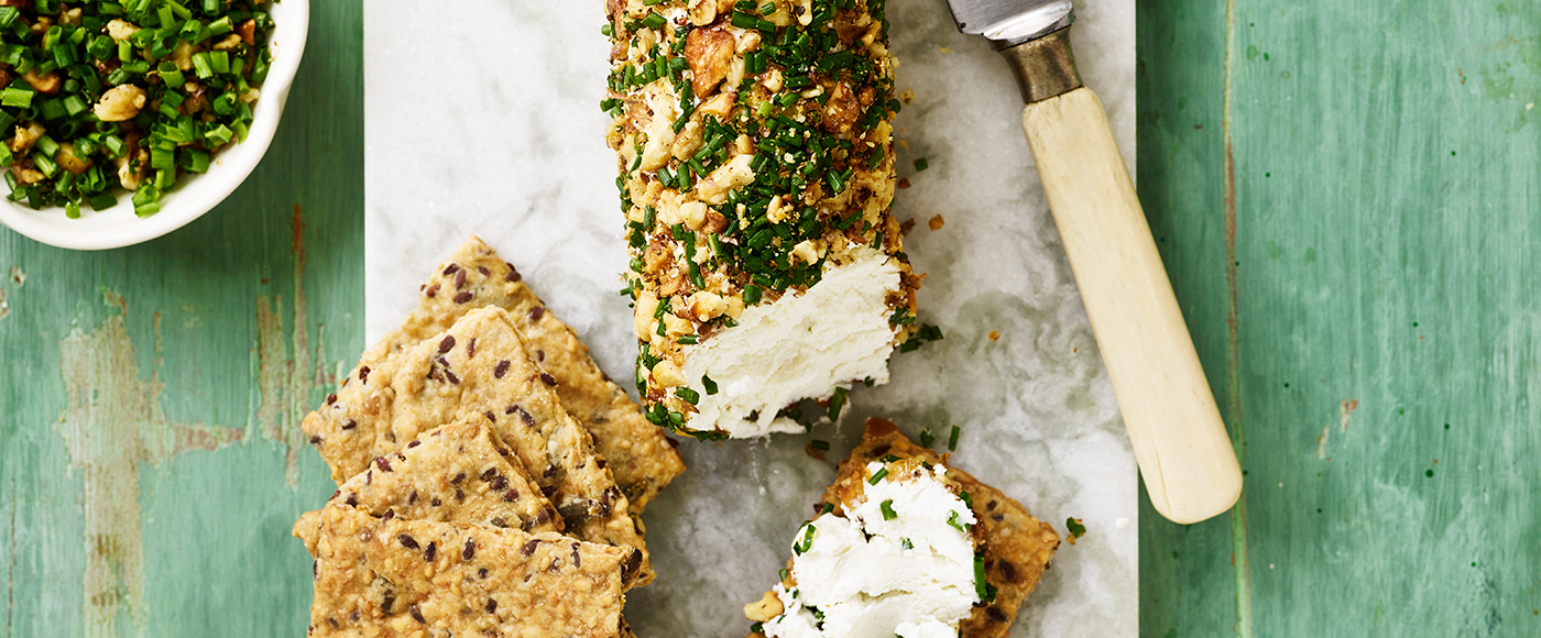 Hæld blandingen ud på en tallerken og rul gedeosten i det, så den bliver dækket af purløgsblandingen hele vejen rundt.