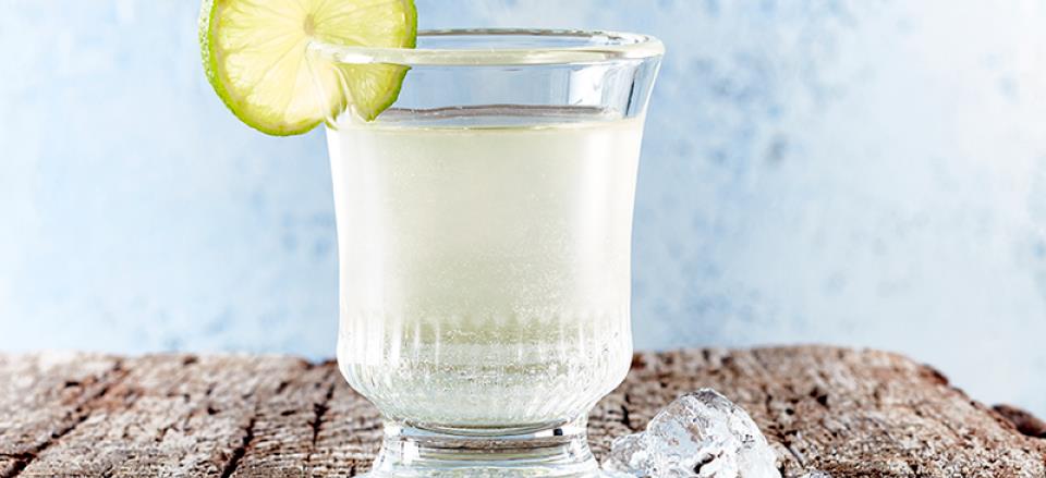 Si drinken ned i et tumblerglas (fladbundet, lavt glas) med is.
