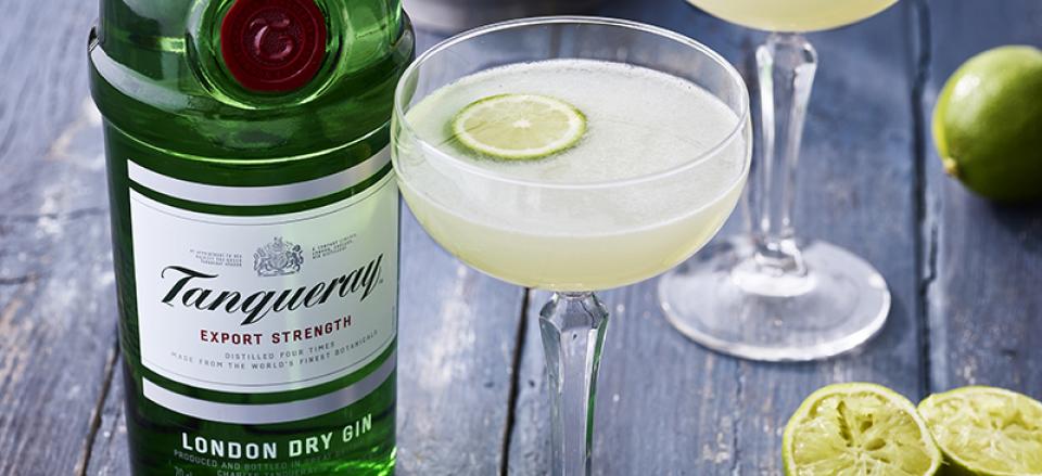 Kom gin, limejuice og sukkersirup i en shaker med isterninger.