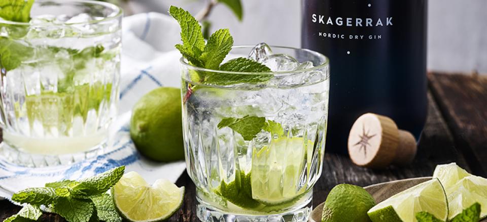 Top med danskvand, og pynt med lidt mynte og en skive lime.