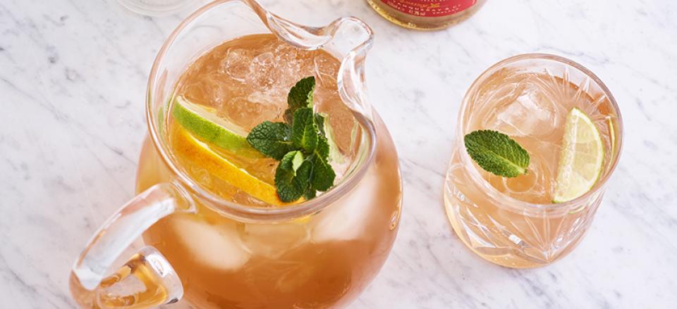 Rør Angostura Bitters i og kom skiver af appelsin og lime i sammen med mynte.