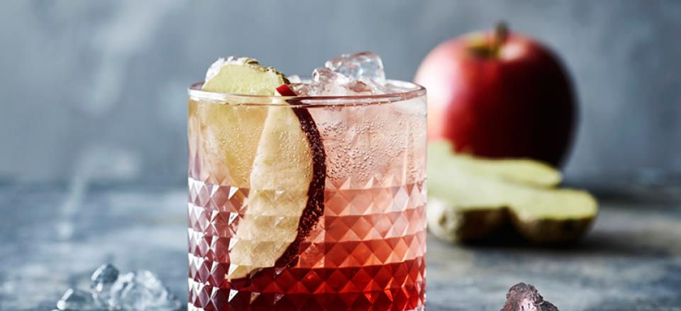 Top med ginger beer og pynt med æble og ingefær og et drys kanel.
