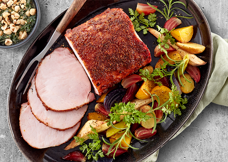 Glaseret julehamburgerryg med ovnbagte rodfrugter og grønlangkål