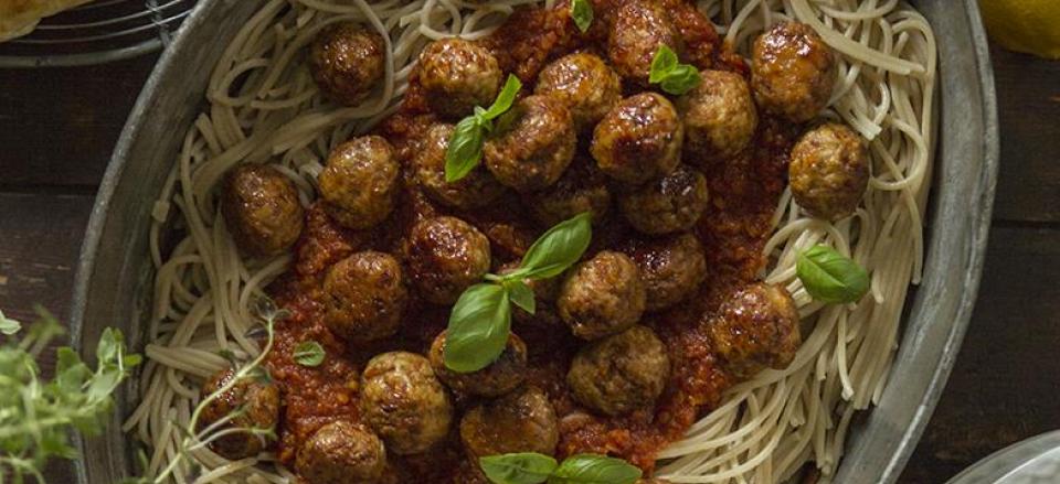 Glutenfri tomatsovs med bagte kyllinge frikadeller