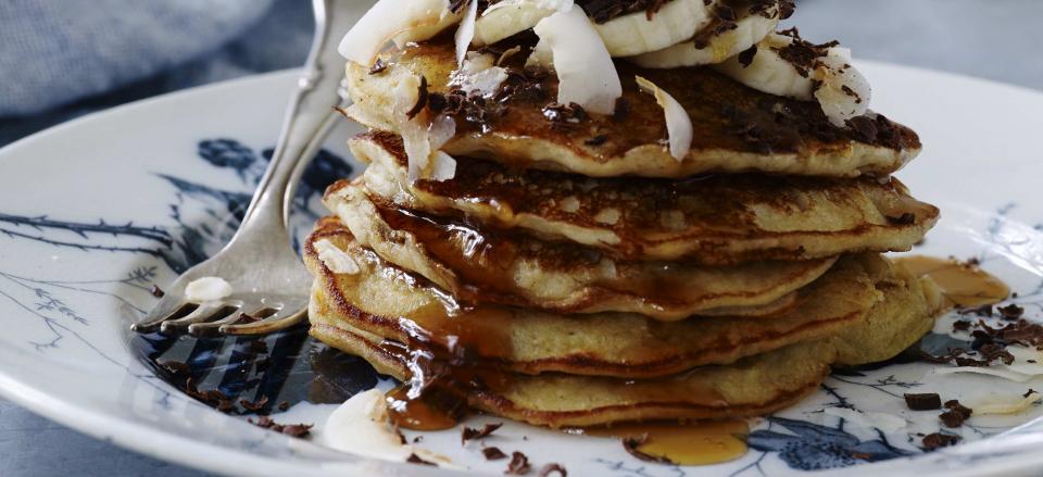Glutenfrie bananpandekager med kokos, honning og chokolade