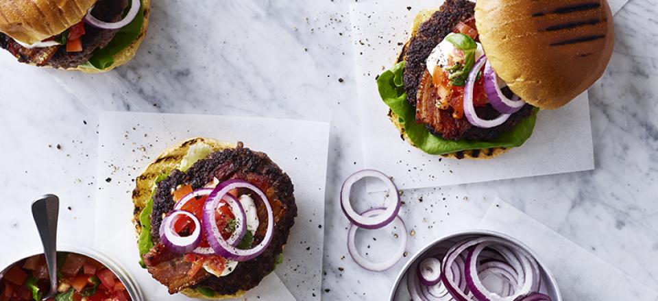 Læg bøfferne i lune burgerboller smurt med aioli og top med bacon, salat, tomatsalsa og bacon.