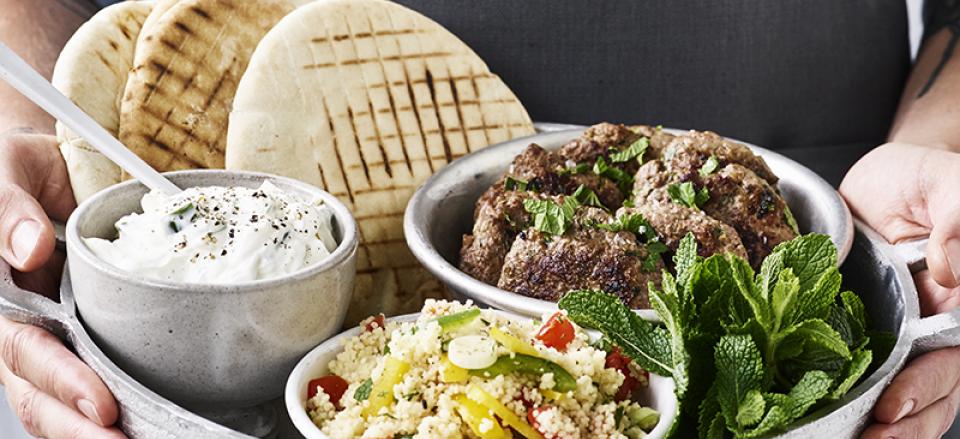 Græske bøffer med pita, couscoussalat og peberfrugttzaziki