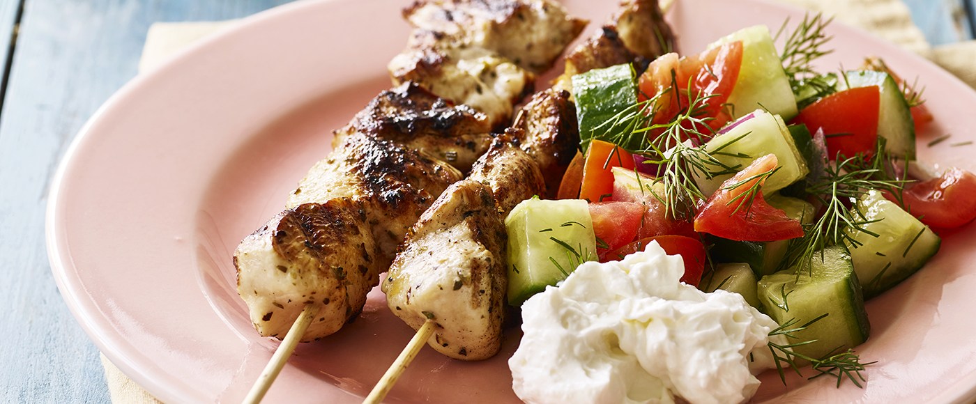 Græske kyllingespyd med fetacreme og agurkesalat