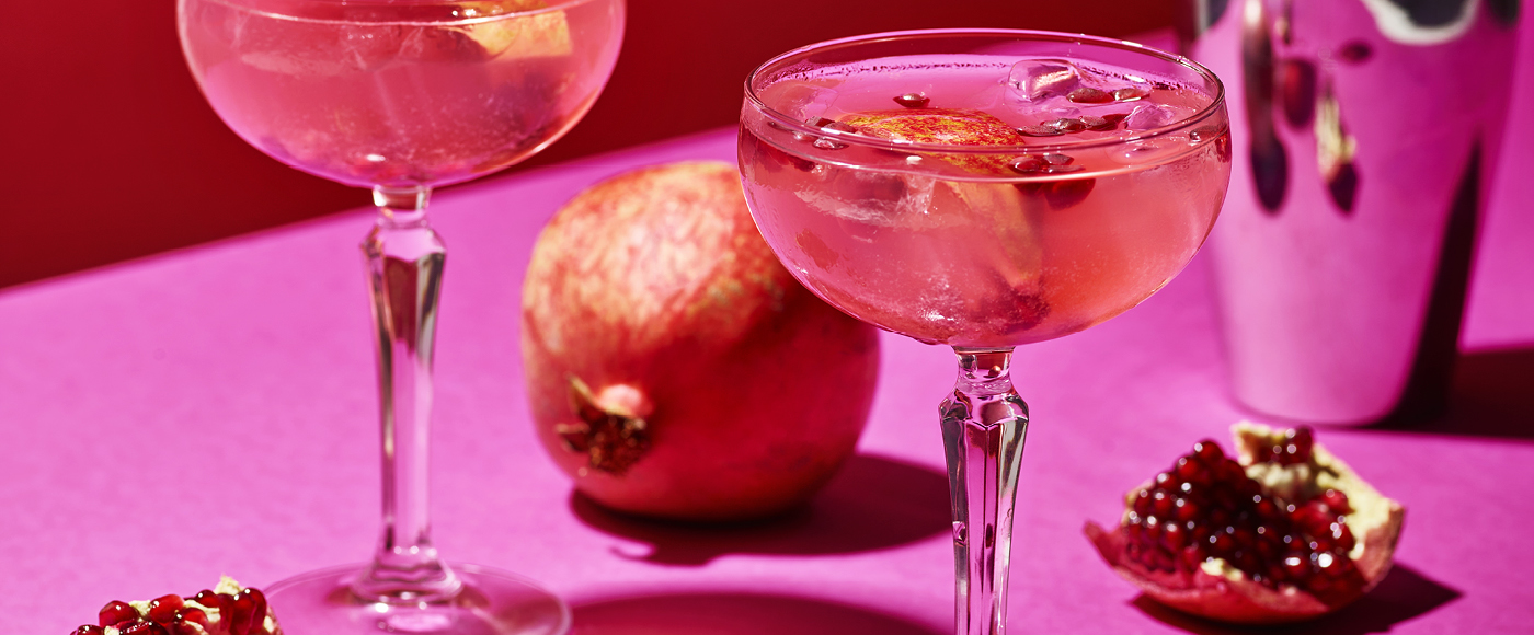 Sigt den over i et cocktailglas og pynt med granatæblekerner.