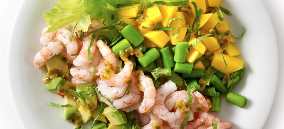 Anret lagvis alle ingredienserne til Grand Prix rejecocktailen på en tallerken eller i høje glas.