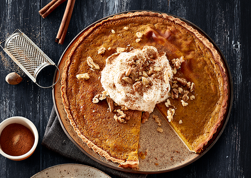 Græskartærte med ristede valnødder og friskrevet muskatnød