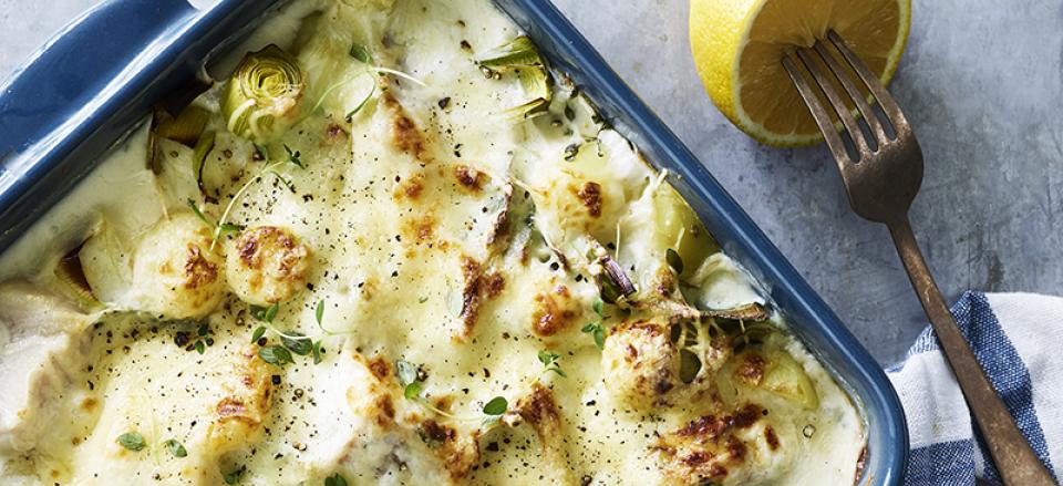 Gratineret sej med kartoffel og porre