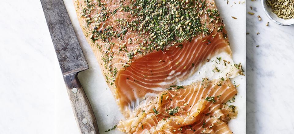 Knus fennikelfrø, korianderfrø og peberkorn i en morter og bland med grofthakket dild, salt, sukker og akvavit.