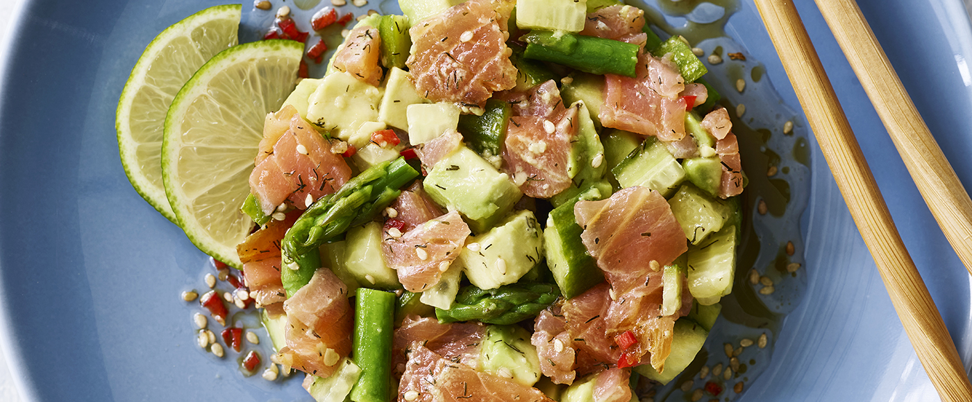 Skær avocado og laks i tern, og vend dem sammen med asparges, agurk, forårsløg og 1 spsk. sesamfrø.