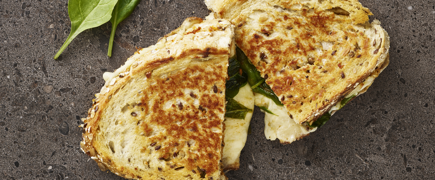 Grilled cheese sandwich med spinat og pesto