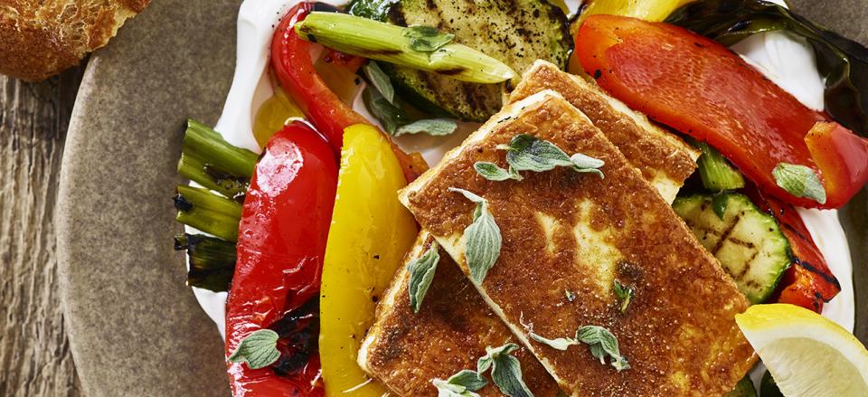 Kom grillede grøntsager og ost oven på yoghurten, dryp med citronsaft, og pynt med oregano.