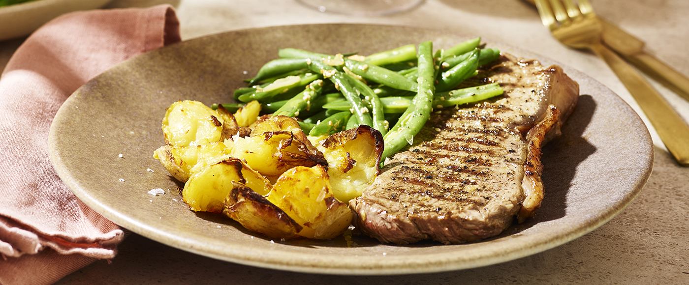 Grillede kalvekoteletter med grønne bønner og knuste kartofler