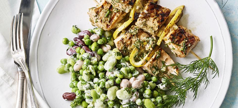 Vend fisken i marinaden, og kom stykkerne på grillspryd med citronskiver imellem.