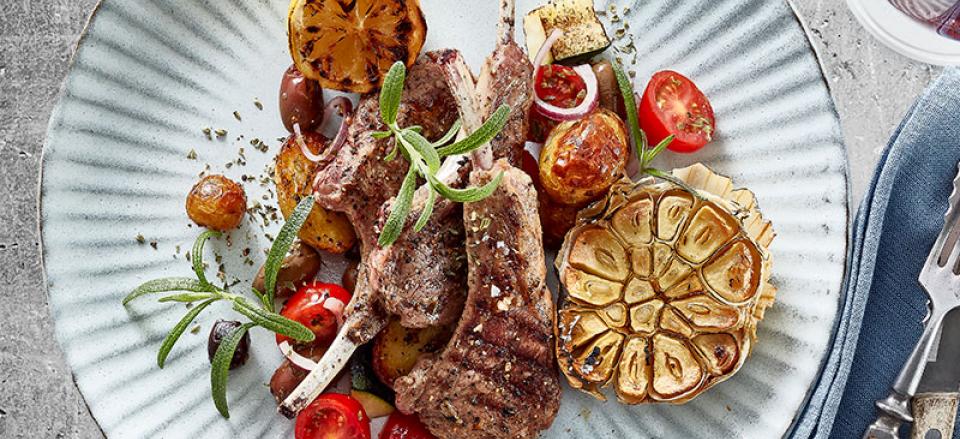 Grillede lammekoteletter med kartoffelsalat, rosmarin og grillede hele hvidløg