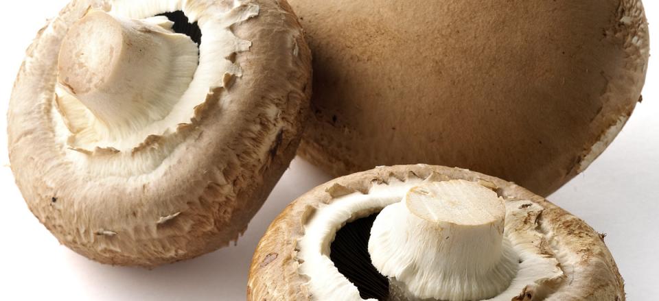 Servér de grillede Portobello svampe på en bund af rucola med balsamico glaze.