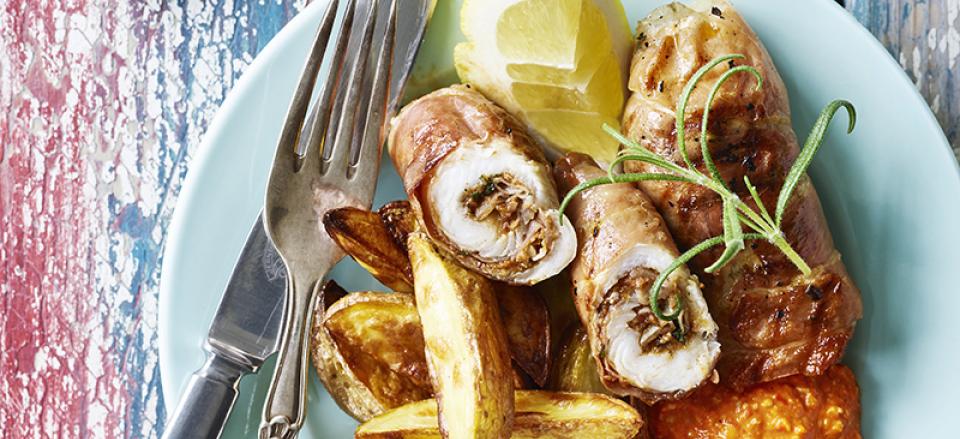 Grillede rødspætteruller med serranoskinke, ovnfritter og romescosauce
