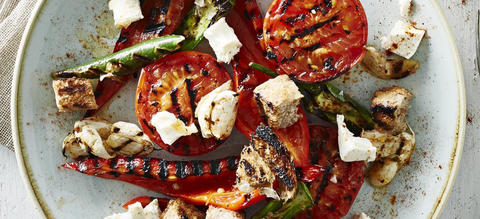Grillede snackpebre, grilltomater og sprøde croutoner