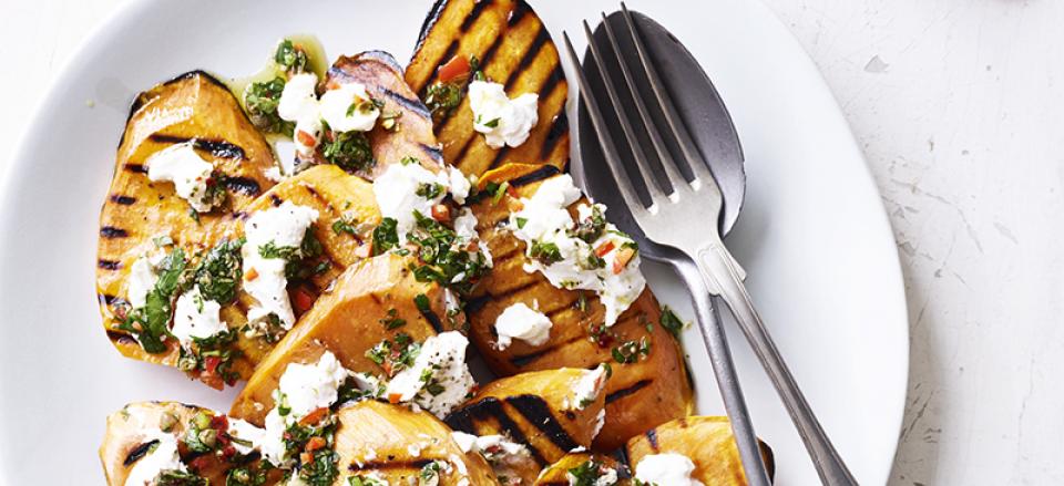 Grillede søde kartofler med sauce verde og gedeost