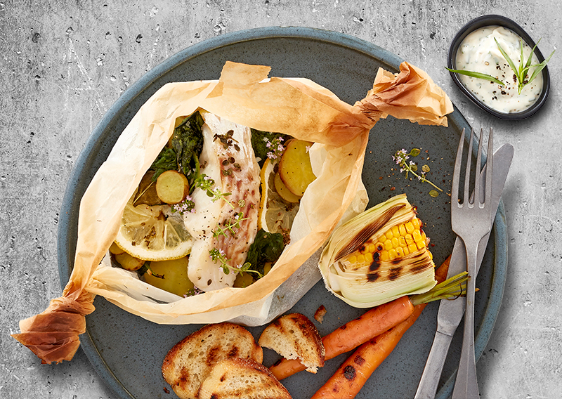 Servér torskepakkerne med grillet grønt, urte-aioli og sprøde skiver flutes.