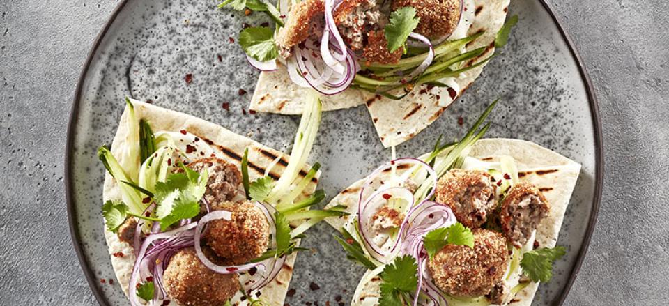 Grillede tortillas med krydrede kødboller, creme fraiche og rødløg