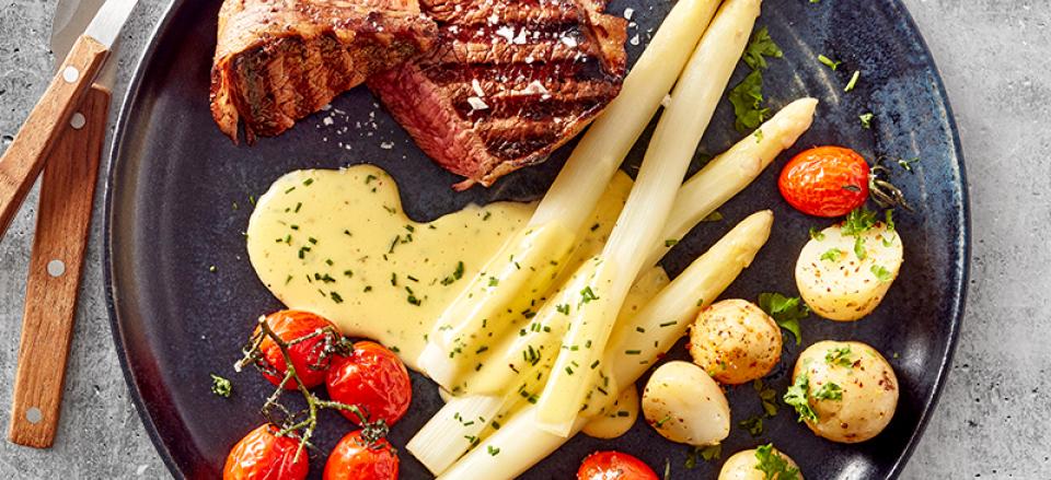 Grillede tykstegsmedaljoner med hvide asparges og sommerkartofler