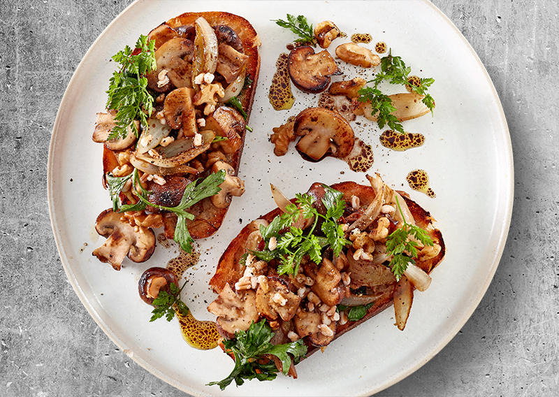 Bland balsamicoeddike og rapsolie sammen til en dressing, og dryp den over baguetteskiverne med svampeblandingen.