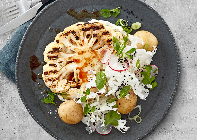 Grillet blomkål med kogte nye kartofler, urteyoghurt og brunet sojasmør