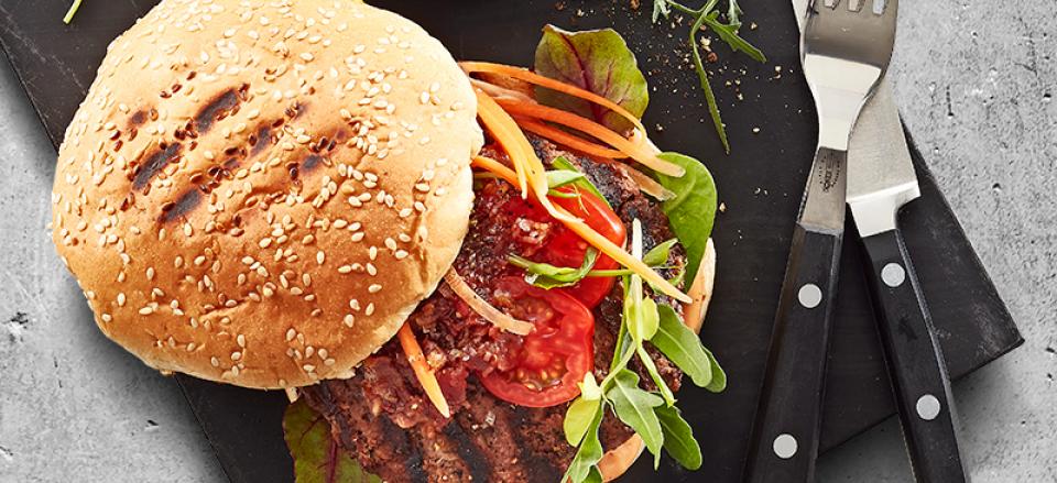 Saml din burger med barbecueblandingen, salat, grillet bøf, cherrytomater, revet gulerod, baconmarmelade og ærtespirer.