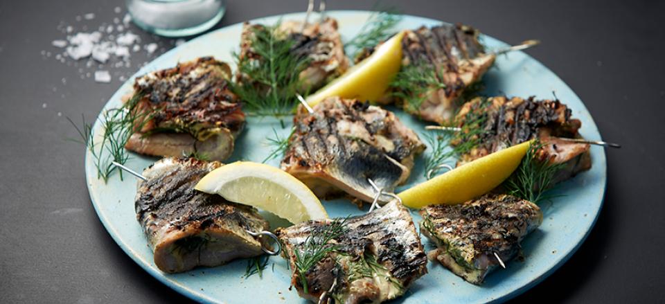 Anret de varme grillede fyldte silde fileter på fad og pynt med frisk dild.