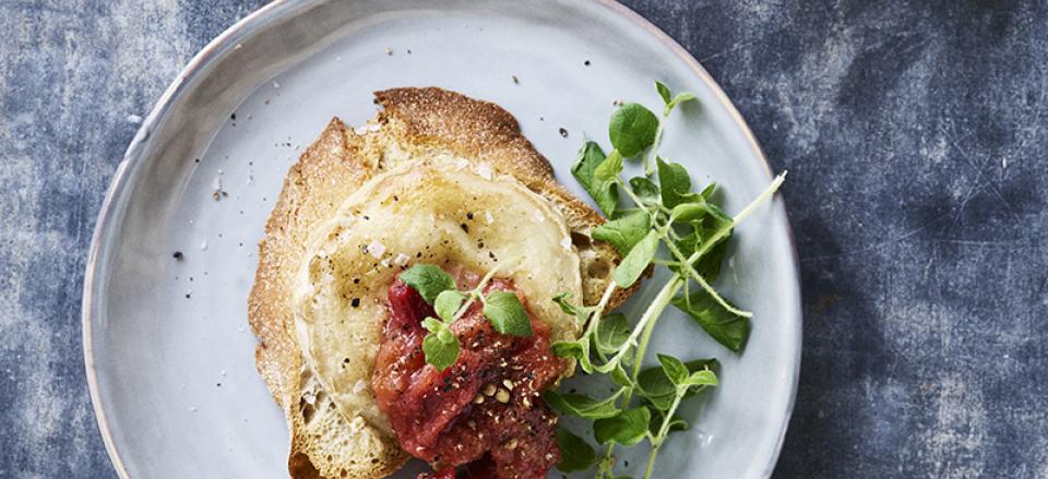 Grillet gedeostebrød med rabarberkompot, koriander og frisk oregano