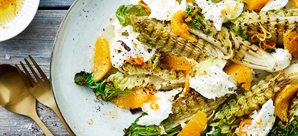 Grill salaten ganske kort, bare så den får striber, og læg over på et fad.