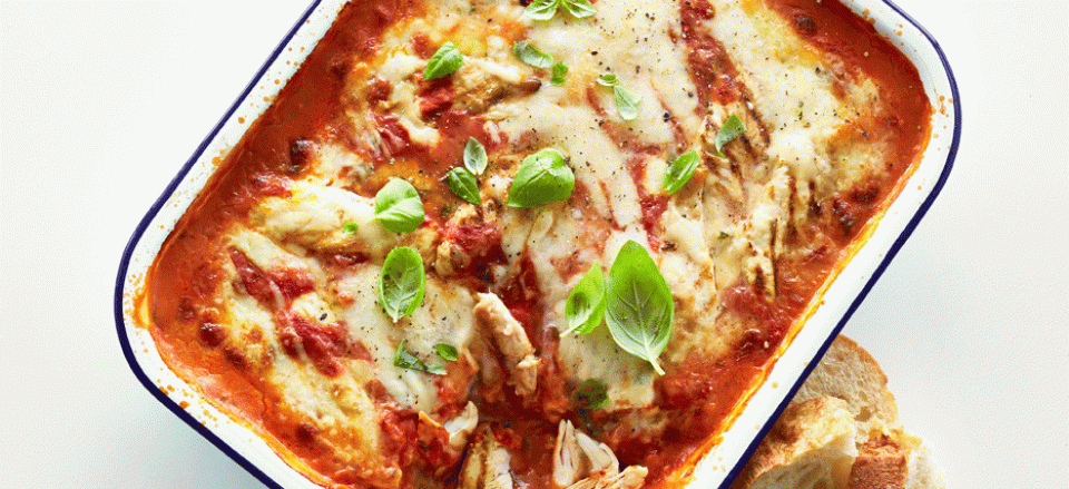 Læg et lag grillet squash, 1/3 af gestus bechamel sauce, stykker af grillet kylling inderfilet, mozzarellabrud, revet parmesanost, basilikum blade, mynteblade, og kværnet peber.