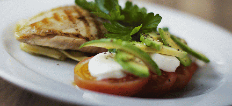 Tomater, mozzarella og avokado skæres i skiver og stænkes med lidt olivenolie, citronsaft, salt og peber.