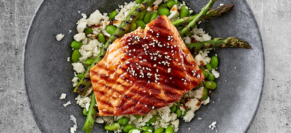Grillet laks med grønne asparges, blomkålsris og teriyakisauce