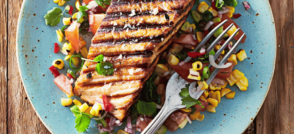 Krydr laksen med salt og peber, og grill den ca. 4 min. på hver side.