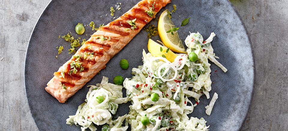 Grillet laks med spidskåls-tzatziki med forårsløg og ærter